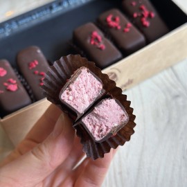 Brinzica naturală cu o aromă strălucitoare de zmeură, combinată cu ciocolată neagră, fără utilizarea coloranților sau aromelor.Ingrediente: sirop de topinambur, zmeură, lapte praf integral, vanilie, unt, ciocolată neagră fără zahărGreutate: 22 g..